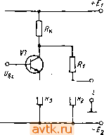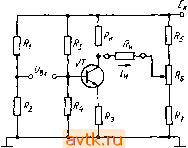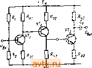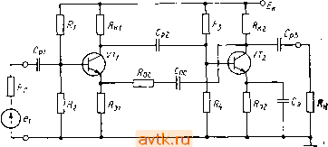 Главная » Электронные устройства автоматики 1 ... 7 8 9 10 11 12 13 ... 26 Расчет усилителя в области низких частот обычно производит-ся при заданных М^ус и сон- Полагая, что частотные искажения Ма в отдельных цепях усилителя одинаковы, будем иметь нус (5.3) ?н=?нус/г, (5.4) где t - число цепей усилителя, создающих низкочастотные иска- жения. ![]() Рис. 5 2 Коэффициент высокочастотных искажений многокаскадного усилителя Мвус определяется произведением коэффициентов высокочастотных искажений отдельных каскадов. Если Мвус задан, то удобно распределить высокочастотные искажения поровну между каскадами. Тогда коэффициент высокочастотных искажений отдельного каскада можно найти из формулы вуо (5.5) где п - число каскадов. Фазовый сдвиг между входным и выходным напряжениями всего усилителя в области высоких частот определяется как сумма фазовых сдвигов в отдельных каскадах. Если высокочастотные искажения распределены между каскадами усилителя поровну, т. е. Тв1=Тв2= - =Твп, то суммарный фазовый сдвиг можно определить из формулы фвус = Пфв. Из формул (5.3) и (5.5) следует, что с увеличением числа каскадов полоса пропускания усилителя сужается. Для расширения полосы пропускания и повышения стабильности коэффициента усиления можно ввести отрицательную обратную связь. При этом, однако, необходимо учитывать, что увеличение фазового сдвига Фус приводит к неустойчивой работе многокаскадного усилителя в области граничных частот полосы пропускания, так как отрица- ельная обратная связь на этих частотах может трансформироваться в положительную (см. рис. 2.9). Принципиальная схема усилителя с общей последовательной отрицательной обратной связью по напряжению и местной по току приведена на рис. 5.2. В этой схеме коэффициент передачи цепи обратной связи по напряжению =RMi+Roc)- (5.6) Коэффициент усиления по напряжению усилителя где 21з1 (/?к1 112) uloc- р л. Р - коэффициент усиления первого каскада с отрицательной обратной связью по току; Явх10с = Гб+{l+hziBl) {Яэ1+Гз) hualRal - входное сопротивление первого каскада. Таким образом, можно записать А aloe---Г--- (0.0) Коэффициент усиления второго каскада Ки2 определяется из формулы - h \.RM\ (/?ос + /?3l)] Ац2-- 21э2-7- При глубокой обратной связи, когда выполняется соотношение /=l-b/Cuioou2P>l, коэффициент усиления усилителя (рис. 5.2) определяется только коэффициентом передачи цепи обратной связи, т. е. Kuoc-i (5.9) § 5.2. Усилители с непосредственной связью (усилители постоянного тока) Резистивно-емкостная связь позволяет наиболее просто осуществить независимость режимов каскадов по постоянному току, однако из-за больших емкостей разделительных конденсаторов вызывает существенные затруднения реализация /?С-усилителей в виде интегральных микросхем. Развитие современной микроэлек-Роники выдвинуло необходимость использования непосредственной вязи Между каскадами усилителя, когда коллектор транзистора предыдущего каскада ОЭ гальванически связан с базой последую, щего. Однако в этом случае при заземленном эмиттере транзисторы, как правило, оказываются насыщенными, так как коллектор, ные резисторы определяют режим по постоянному току как основ-ного, так и последующего каскадов. Для обеспечения работы транзистора в режиме класса А в эмиттерные цепи включают резисторы R. 1-г-~г- vr, -\VT, -\VT - I 211-J -T-о -o fR I Рнс. 5 3 Рис. 5 4 На рис. 5.3 приведена схема л-каскадного усилителя с непосредств