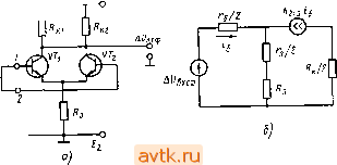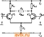 ![]() Рис. 5.10 выход, когда выходное напряжение снимают между одной из выходных шин и землей (рис. 5.9, б). При подаче на входы усилителя напряжений Ubxi и Ubx2 выходное напряжение в общем случае определяется выражением \ Ых\=Кил\ивх1 - ивх2\+Кисф\ивх1 + ивх2\/2, ГДб \ Ubx1-Ux2\ ~/вхд - дифференциальная составляющая входного сигнала, определяемая как разность потенциалов между входами усилителя; I 1 +fBx21/2= {/вхсф -синфазная составляющая входного, определяемая как полусумма входных напряжений; Кил - коэффициент усиления дифференциального сигнала, определяемый при вхсф=0. Для обеспечения этого условия на входы усилителя одаются одинаковые по величине, но разные по полярности на-Ряжения; /Сисф - коэффициент усиления синфазного сигнала, определяемый при {/вхд=0. Для этого на входы усилителя па-даются одинаковые по величине и полярности напряжения. Синфазный сигнал представляет собой различные помехи и наводки, действующие одновременно на обоих входах усилителя Поэтому при построении усилителя необходимо обеспечить уело! вне ид>исф; (5.19) простейший дифференциальный усилитель с симметричным выходом на биполярных транзисторах изображен на рис. 5.10 и состоит из двух типовых каскадов ОЭ, эмиттеры которых взаимосвязаны и имеют общий резистор Ra. Входные напряжения подаются на базы транзисторов, а выходное снимается с их коллекторов. ![]() Рис. 5 11 Если схема полностью симметрична, т. е. Rki = Rki=Rk, а параметры транзисторов идентичны, то при AUexn-UBxi - /вх2 = О транзисторы работают в одинаковом режиме. Их коллекторные токи и напряжения равны. Так как выходное напряжение определяется разностью коллекторных напряжений транзисторов, то их равенство означает, что вых = к1-к2 = 0. (5.20) Изменения питающего напряжения или температуры окружающей среды, вызывающие дрейф выходного напряжения в обычном каскаде усилителя постоянного тока (см. рис. 5.7), для симметричного каскада (рис. 5.11, а) можно представить как заземленные ЭДС, действующие синфазно на каждом выходе 1 к 2 каскадов ОЭ. Д з,1 = А^з = А^з ф. (5.21) Действие синфазных ЭДС приводит к одинаковому изменению коллекторных токов и напряжений транзисторов в одну и ту же сторону, т. е. Равенства (5.21) и (5.22) показывают, что базы, а также кол-кторы транзисторов усилителя можно объединить, не нарушая и этом работы схемы, и представить усилитель как параллельное соединение транзисторов VTj и VT2, включенных по схеме ОЭ с отрицательной обратной связью по току, создаваемой резисто- Р°*Эквивалентная схема для переменного сигнала, соответствующая принципиальной схеме рис. 5.11, а, изображена на рис. 5.11,6. 03 эквивалентной схемы найдем коэффициент передачи синфазного сигнала на один из выходов усилителя, характеризующий изменение коллекторного напряжения АСкоф при действии входного синфазного сигнала At/вхсф: /С:сф=Д^.еф/Д^вхср=-f. (5.23) вх ОС Входное сопротивление схемы для синфазных сигналов /?вх ос = 6/2+ Л2,з(Гз/2+/?,). , . Полагая, что /?э>/э, /г21э/?э>б, будем иметь вхос~/г21э'?э. (5.24) Подставляя выражение (5.24) в (5.23), запишем KU-RJ{2R,), (5.25) откуда найдем изменение коллекторного напряжения каждого транзистора при действии синфазного входного сигнала Д^ксф= /С:сфД^/вхсф= Д^вхсф. (5.26) в полностью симметричном дифференциальном усилителе At/ксф не влияет на дрейф выходного напряжения, так как с учетом равенства (5.22) Д^выхсф==Д^к1сф-Д^к2сф = 0. (5.27) Следовательно, /Сисф = А1выхсф/А{/вхгф=0. в реальной сх