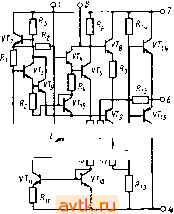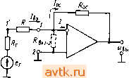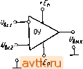 Выход Рис. 6.2 Входной каскад представляет собой дифференциальный усилитель, свойства которого определяют входные параметры всего операционного усилителя. К входным параметрам ОУ относится дифференциальное входное сопротивление Явхоу, измеренное между входами ОУ. Для повышения /?вхоу во входном каскаде использу- от полевые транзисторы или биполярные транзисторы со сверхвысоким коэффициентом усиления тока базы hia в микроампер- *иапазоне рабочих токов. Например, при /эо=10 мкА, Л21э= ШО будем иметь -А21эГ,=Л21э-Ц^=26. МОм. Raxoy = fl к входным параметрам ОУ также относятся входное напряжение смещения {/вхсм и разность базовых токов смещения ioi и 1 Эти параметры отражают факт появления напряжения ошибки на выходе ОУ при его замкнутых входах. Напряжение ошибки {/выхош определяется двумя составляющими: и'яык ош и {/ выхош. Первая составляющая f/выхош обусловлена разбалансом внутри входного каскада. Несимметрия входного диф. ференциального усилителя, в частности неидентичность напряжений {/бэо транзисторов, приводит к разным коллекторным токам и, как следствие, к появлению напряжения разбаланса на выходе каскада даже при одинаковых потенциалах на его входах, т. е. при нулевом дифференциальном входном напряжении. Напряжение разбаланса, усиливаясь последующими каскадами ОУ, вызывает появление на выходе ОУ составляющей напряжения ошибки f/вых ош. Значение {/вых ош определяется по входному напряжению смещения {/вх см= f/вых ош Си оу, которое является справочной величиной, задаваемой разработчиками для каждого типа ОУ (/( оу- коэффициент усиления дифференциального сигнала операционного усилителя). Входное напряжение смещения Ubx си основных типов ОУ лежит обычно в пределах ±(1 -10) мВ и показывает, какое напряжение следует приложить к входам ОУ для приведения напряжения ошибки {/выхош на выходе ОУ к нулю. Вторая составляющая выходного напряжения ошибки f/выхош обусловлена разностью входных токов дифференциального усилителя ОУ. При неидентичности параметров транзисторов дифференциального каскада ОУ базовые токи смещения /501 и /502 по значению будут отличаться друг от друга. Вследствие неравенства базовых токов напряжения на входах / и 2 относительно земли также будут различны, что приведет к возникновению дифференциальиого входного напряжения. Усиливаясь, это напряжение вызывает появление второй составляющей выходного напряжения ошибки t/выхош. Разностный ток /вхразн= /б01-/б02> ТаК ЖС КаК и f/flXCMi является справочным параметром. Для основных типов ОУ значения лежат в пределах 0,02-3 мкА. Казалось бы, составляющую {/ вых от можно исключить, обеспечив нулевые значения базовых токов /501 и /бог- К сожалению, этого нельзя сделать, так как при нулевых значениях базовых токов транзисторы дифференциального каскада были бы закрыты. Задавая определенное значение базового тока, обеспечивают номинальный режим работы транзистора. В отдельных случаях составляющие выходного напряжения ошибки, обусловленные совместным действием Uxcm и /вхразш направлены противоположно и компенсируют друг друга. В другие случаях они складываются, и выходное напряжение ошибки является суммой составляющих t/выхош и f/выхош- Для установки нулевого уровня выходного напряжения ОУ используют цепь регулировки нуля, состоящую из системы резисторов, подключенных к одному из входов ОУ. Промежуто