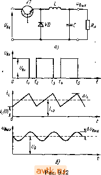 Главная » Электронные устройства автоматики 1 ... 17 18 19 20 21 22 23 ... 26 пряжений на обоих входах и формирует управляющее напряжение на входе регулирующего элемента (ключа), закрывая или откоы вая его. При отклонении выходного напряжения от номинального значения изменяется момент времени срабатывания компаратора т. е. длительность управляющего импульса на входе ключа. Принцип работы схемы (рис. 9.11, а) можно проиллюстрировать с' помощью временных диаграмм (рис. 9.11, б). Существует класс импульсных стабилизаторов релейного типа в которых схема сравнения представляет собой релейное устройство, которое срабатывает, если часть выходного напряжения становится равной значению порогового напряжения U op реле. Недостатком стабилизаторов релейного типа являются относительно высокие пульсации выходного напряжения, так как срабатывание релейного устройства осуществляется только при изменении выходного напряжения. Поскольку напряжение после ключевого элемента представляет собой последовательность импульсов, необходимым элементом импульсного стабилизатора является сглаживающий фильтр с высоким коэффициентом сглаживания. Обычно в качестве сглаживающего фильтра в импульсных стабилизаторах используют Г-образные LC-фильтры. Процессы, характеризующие работу импульсного стабилизатора с Г-образным LC-фильтром (рис. 9.12, а) без учета особенностей системы формирования управляющих импульсов, проиллюстрированы временными диаграммами на рис. 9.12, б. Предположим, что в момент времени t=0 регулирующий транзистор открыт и ток через катушку индуктивности нарастает по линейному закону: ![]() (9.16) где tt(0)-ток, проходящий через катушку в момент отпирания транзистора. В момент времени t=-t\ транзистор закрывается (ключ размыкается). Ток Uiti) убывает также по линейному закону, протекая через открытый диод (в отсутствие диода на закрытом транзисторе розникли бы недопустимые перегрузки по напряжению, которые могли бы привести к выходу его из строя): iLiM-i- (9.17) Затем в момент времени t2 снова замыкается ключ (открывается транзистор) и ток ii начинает увеличиваться по линейному закону. Цикл повторяется. Режим работы стабилизатора при 11(2) >0 называют режимом непрерывного тока. В этом случае выражение для определения пульсации тока, протекающего через катушку индуктивности можно записать как Al- (t2-h)= / зам- (9.18) Пульсацию выходного напряжения А^вых определим, учитывая, что в установившемся режиме работы схемы средние значения токов, прогекающих через катушку индуктивносги и нагрузку, равны между собой. Следовательно, среднее значение тока, протекающего через конденсатор, равно нулю, а изменение напряжения на нем (пульсация выходного напряжения определяется только пульсацией тока tl). Когда ток ii выше среднего значения /ю; напряжение иа конденсаторе с увеличивается. При уменьшении it относительно ho напряжение Uc также уменьшается. Таким образом, можно записать уравнение балланса электрических зарядов в цепи катушки индуктивности и конденсатора - = 2Ш,,С, (9.19) где Г - период переключения ключевого транзистора, AiJ2 - среднее значение тока, протекающего через конденсатор за половину периода, т. е. Т/2, 2А{/вых - изменение напряжения на конденсаторе за половину периода. Подставляя ,выражение (9.18) в (9.19), после несложных преобразований получим (вх-вых)4ам (9 20) Из выражения (9.20) следует, что д