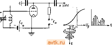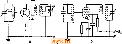 ![]() Рис. 234. Схемы сеточных детекторов на тран зисторах базу небольшое (-0,1---0,3 в) начальное смешение, а это практически трудно сделать. Иногда схема лучше работает без сопротивления в цепи базы: утечкой служит проводимость между базой и другими электродами. Трудность регулирования детекторов на транзисторах вынуждает преимущественно применять диодное детектирование на полупроводниковом диоде с последующим усилением низкой частоты на Транзисторах* Регенератор В анодном и сеточном детекторах на управляющей сетке лампы создается напряжение высокой частоты, которое усиливается детекторной лампой. Поскольку в схемах, показанных на рис. 229 и 233, это напряжение не используется, то оно замыкается на землю через конденсатор Ci (200-300 пф), В сеточных детекторах сеточный ток создается за счет энергии, отбираемой из контура. Расход энергии контура на образование сеточного тока соответствует увеличению потерь в контуре, что расширяет его резонансную кривую, ухудшает избирательность и уменьшает напряжение на контуре. Чтобы сделать резонанснук) 1 ... 21 22 23 24 25 26 27 28 |