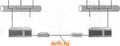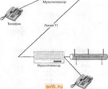 Устройство CSU/OSU Рис 3.2. Соединение двух локальных сетей через линию DD5 Магистрали класса Т в системах магистралей класса Г допустимо объедгатять несколько различных типов данных (например, дашше из локальной сети и голосовую связь) и передавать их по од1юму высокоскоростному каналу. Устройство, способное объединять сигналы с разных кана-юв в одни и распределять полученный поток по соответствующим каналам, называется мультиплексором, или MUX. На рис. 3.3 изображены две локальные сети, связанные магастралью класса Т. Мультиплексоры, находящиеся на обоих концах цифровой линии, предназначены для группировки и разгруппировкп раэ;тчпых каналов данных. Линия Т1 является основной единицей системы магистралей класса Т. Она состоит из 24 каналов с процускной способностью в 64 Кбнт/с каждый, что обеспечивает общую скорость передачи, равную 1,544 Мбит/с. Существуют и другие типы магистралей imacca Т с большим числом каналов и большей пропускной способностью, но они значительно дороже. В табл. 3.1 представлены раалнчные виды линий класса Т. Таблица 3. J. Системы магистралей класса Т Т1 fT2* 24 96 672 -1032 1,544 6.312 44,736 274,76 Наиболее достутшым типом машстрали является линия Т1, ностроенная иа медном проводе. Как упоминалось ранее, небольшие фирмы могут арендовать ifjU-Ethernet {LANW J