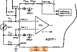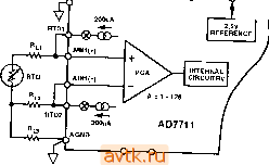 AGND DGND Vss TFS MODE SDATA SCLK DRDY AO Рис. 14 Аналогичный вход для сигналов высокого уровня есть и у AD7713 (рис. 15), но в отличие от предыдущей, она к тому же имеет два (а не один) дифференциальных входа и два встроенных 200-микроампер-ных источника тока. Для того, чтобы реализовать эти возможности, не увеличивая числа выводов микросхемы, разработчикам пришлось удалить из AD7713 встроенный источник опорного напряжения - как мы уже могли убедиться, в наиболее типичных применениях микросхемы его с успехом заменяет прецезионный резистор. ОСОБЕННОСТИ AD7730 и AD7731 AD7730 является специализированной микросхемой, предназначенной для работы с мостовыми датчиками - не зря сама Analog REF REF I-О-О-О-О- ![]() RTDr 6-®-C!D- SERIAL INTERFACE