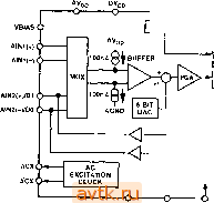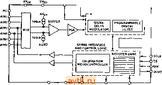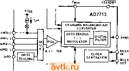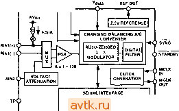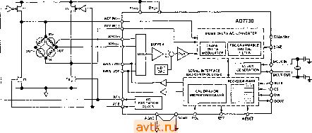ASND DGND RFS TFS MODE SDATA SCLK DRDY AO Рис. 15 Devices окрестила ее как Brige Transducer ADC. Она имеет две пары дифференциальных входов (рис. 16), оба вывода одной из которых могут быть использованы в качестве цифровых выходов для управления теми или иными микросхемами или устройствами. Кроме того, AD7730 имеет два выхода (АСХ и АСХ ), позволяющие изменять полярность сигнала, возбуждающего мостовую схему (и корректно учитывать его при измерении), что повышает точность преобразования. REFINH REFINW ![]() REFERENCE DETECT AD7730 SIGMA-DELTAA/d CONVERTER j Cj) STaHdBY