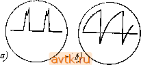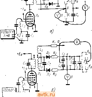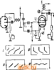 Следует помнить, что измерять напряжение непосредственно на аноде лампы выходного каскада горизонтальной развертки нельзя. Это напряжение измеряется косвенным путем-на выводе / строчных автотрансформаторов ТВС-А и Т,ВС-Б (70°), выводе 4 ТВС-110 и ТВС-1 ЮМ и выводе 5 ТВС-ПОА. При производстве измерений рекомендуется вынимать лампу высоковольтного выпрямителя из ее панельки. Отклоняющая система должна быть обязательно подключена к телевизору. Величины напряжений, измеренные и записанные в таблицу, сверяются с режимами, обозначенными на принципиальной схеме в описании конструкции, или с типовыми режимами, указанными в приложении 2 или справочниках поэлектровакуумным приборам. Ориентировочно проверку режимов можно производить, руководствуясь также табл. 22. Таблица 22 Каскад тел*ви ора УПЧ изображения и звукового сопровождения Видеоусилитель Ограничитель Амплитудный селектор Генератор вертикальной развертки Выходной каскад кадровой развертки Генератор горизонтальной развертки Выходной каскад горизонтальной развертки Напряжение в точке а на рис. 69 (в схемах выходного каскада горизонтальной развертки с обратной связью по питанию)