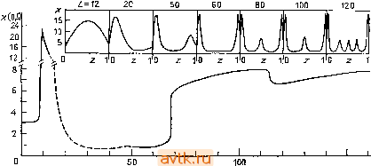 z 10 120 Ut) UO Рис. 6.21. Эволюционная диаграмма для задачи 13 при ГУ2, ц = 0,0035, v = = 0,0045, Ро = 6- Ю-*, с = 0,05, с' = 0,025, Dx = 0,01, Dy = 0,45, р = р' = = 3,2. Величина L изменялась по закону L (/)= 6-f 0,0002/; схема (6.4.3), W = 1/2, л = 48, т = 125. В верхней части рисунка приведены характерные профили концентрации х. На рис. 6.22 представлена эволюционная диаграмма по параметру L для задачи 13 в случае ГУ1 (остальные параметры выбираются такими же, как на рис. 6.21); соответствующая диаграмма стационарных решений не строилась. На этом рисунке, так же как и на предыдущем, приведены характерные профили переменной х для избранных значений длины L. Как и в случае ГУ2, здесь также при увеличении L структура решения становится все более сложной (число максимумов и минимумов на пространственных профилях растет). Более подробно эти результаты обсуждаются в работе [6.32]. ) Имеются в виду стационарные (периодические и т. д.) решения уравнений прн постоянных, не зависящих от времени, значениях параметров. - Лрим. ред. На рис. 6.23 изображена эволюционная диаграмма для задачи И с ГУ2 при таких значениях параметров, когда существуют устойчивые периодические рещения (Л = 2, В = 5,45, ![]() Lif) Рис. 6.22. Эволюционная диаграмма для задачи 13 при ГУ1. Параметры выбирались такими же, как иа рис. 6.21; схема (6.4.3), w = 1/2, га = 80, т = = 125; сплошные линии - симметричные профили, штриховые - асимметричные профили. 2,6- ![]() О 2 4 6 й L Рис. 6.23. Эволюционная диаграмма для задачи 11 при ГУ2, Л = 2, В = 5,45, Dx = 0,008, Dy = 0,004, L (t) = 0,45 + 0,0055/; Да; (0) = max [a; (0, /)] - - тш[дг(0,/)], где максимальное и минимальное значения оцениваются для /, меняющегося в пределах одного периода. Z)x = 0,008, Dy = 0,004). При малых значениях L здесь существует устойчивое пространственно однородное периодическое рещение, которое теряет устойчивость вблизи значения L = 2. При больших значениях L сосуществует большое число устойчивых периодических решений; так, например, при L - 4,5 их уже минимум пятнадцать (для периодических решений и ГУ2 также действует принцип суммирования решений, см. п. 4.3.1). Все эти решения имеют примерно тот же период, что и однородное решение, т. е. Г л; 3,8. Эволюционная диаграмма, приведенная на рис. 6.23, была построена следующим способом. При L = 0,45 однородное периодическое решение является устойчивым. При изменении L(t) в интервале (0,45; 2,2) в вычисления вводились случайные флуктуации (возмущения) значений решения с амплитудой 0,01, в результате решение перешло из окрестности ветви однородных периодических решений на ветвь неоднородных решений. При этом последовательно (с ростом L{t)) возникают периодические решения со все более и более сложной структурой (имеющие больше максимумов и минимумов). На оси ординат эволюционной диаграммы на рис. 6.23 откладывается величина Ax(0), которую можно рассматривать как амплитуду колебаний на границе системы. Каждый минимум представленной на рисунке кривой отвечал возникновению более сложной структуры. Более подробный лнализ периодических решений задачи 11 представлен в работе [6.33]. Подчеркнем, что построение эволюционных диаграмм для распределенных систем требует большого объема вычислений, особенно в случаях, когда в задаче возникают периодические решения. Особую роль при этом играет подходящий выбор коэффициента а в формуле L = Lo -\- at. К тому же сами эксперименты с указанной величиной (с тем, чтобы определить, какое наибольшее значение а мы можем выбрать) требуют доволь
