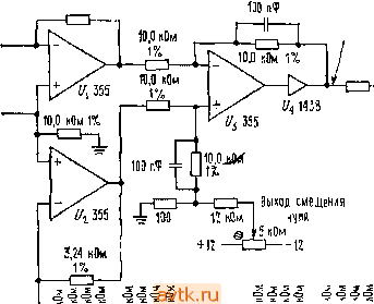 + 10,0 преобразо-ватЕПь уровня 16 Ш -С d,ot мкф т=: -10,0 ![]() Рис. 9.72. Простой источник псевдослучайного шума. С частотой 1,0 МГц и его выходной сигнал принимает значения+10 и -10 В. Этот сигнал пропускается через простой низкочастотный /?С-фильтр, имеющий затухание 3 дБ на частоте 1 кГц (рис. 9.72). На выходе этого фильтра можно точно вычислить среднеквадратичное напряжение шума. Из предьщущего уравнения мы знаем, что среднеквадратичное значение напряжения шума на выходе преобразователя уровня равно 14,14 мВ/Гц/ . Из разд. 7.20 известно, что полоса пропускания НЧ-фильтра составляет (л;/2)-1,0 кГц или 1,57 кГц, и, следовательно, выходное напряжение шума будет равно Ug= =0,01414 (1570)=560 мВ, а его спектр соответствует однозвенному низкочастотному /?С-фильтру. 9.38. Низкочастотная фильтрация Аналоговая фильтрация. Полезный спектр шума, сформированного при помощи псевдослучайной последовательности, лежит в пределах от f-aJK (величина, обратная периоду повторения) до высокочастотного значения, составляющего приблизительно 20% от /а„ (на этой частоте удельная мощность шума падает на 0,6 дБ). Как было показано в предыдущем примере, для формирования шума вполне подходит простой НЧ-фильтр на /?С-цепи при условии, что его уровень затухания 3 дБ лежит намного ниже тактовой частоты (например, менее 0,01 /акт)- Д-я того чтобы используемую часть спектра приблизить к тактовой частоте, желательно применять фильтры с крутой характеристикой на частоте среза, например фильтры Баттерворта или Чебышева. В этом случае плоская часть результирующего спектра будет определяться характеристиками фильтра, которые должны быть измерены, поскольку отклонения в параметрах элементов могут вызывать колебания коэффициента передачи в полосе пропускания. С другой стороны, если требуется обеспечить точное значение напряжения шума на Гц /!, необходимо измерить фактическое значение коэффициента передачи фильтра по напряжению. Цифровая фильтрация. Недостатком аналоговой фильтрации является необходимость подстраивать частоту среза фильтра, если тактовая частота изменяется в широких пределах. В подобных ситуациях хорошим решением является применение цифровой фильтрации, которая выполняется путем формирования взвешенных аналоговых сумм последовательных выходных битов (нерекурсивная цифровая фильтрация). Эффективная частота среза такого фильтра будет изменяться в соответствии с изменением тактовой частоты. Кроме того, цифровая фильтрация позволяет работать при предельно низких значениях частоты среза (доли герца), где аналоговая фильтрация оказывается неудобной. Для того чтобы произвести взвешенное суммирование одновременно всех разрядов, достаточно выходы последовательных ячеек регистра соединить с точкой суммирования операционного усилителя через резисторы различных номиналов. Для НЧ-фильтра весовые коэффициенты должны быть пропорциональны (sin х)/х. Заметим, что часть сигналов в этом случае придется проинвертировать, поскольку весовые коэффициенты могут иметь любой знак. Так как в данной схеме конденсаторы не используются, выходной сигнал будет состоять из последовательности дискретных уровней напряжения. Приближение к гауссову шуму можно сделать более близким, взяв с соответствующими весами большее число битов в последовательности. Кроме того, аналоговый выход в этом случае будет п
