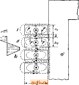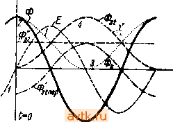 Главная » Действие трехфазных трансформаторов 1 ... 9 10 11 12 13 3) что можно считать поток рассеяния вторичной обмотки Ф^, а следовательно, и поток в сердечнике при коротком замыкании Ф^ равными главному потоку при нормальной работе, т. е. потоку, соответствующему нормальному напряжению V,. В рассматриваемом случае в момент короткого замыкания главный поток Ф проходит через нуль. Начиная с этого момента, поток в сердечнике начинает нарастать, но по кривой 3, имеющей вдвое меньшую амплитуду, чем кривая 2 главного потока, ибо одновременно с потоком в сердечнике Ф^ будет нарастать и поток рассеяния вторичной обмотки Ф^а по кривой 4. Сумма значений потоков Ф^ и Ф^з равна главному потоку Ф, проходящему через сердечник при нормальной работе. Но та же сумма, взятая с учетом направлений потоков для вторичной обмотки, даст нуль (см. рис. 200). Это значит, что вторичная короткозамкнутая обмотка будет стремиться сохранить свое магнитное состояние, бывшее в момент короткого замыкания, когда ни одна силовая линия ее не пронизывала. Так как поток рассеяния вторичной обмотки совпадает по фазе с током в ней и ему пропорционален, то кривая 4 в другом масштабе может иллюстрировать изменение вторичного тока при коротком замыкании. Так как, далее, первичный ток в рассматриваемом случае короткого замыкания (когда потерь в трансформаторе нет) равен вторичному, но прямо противоположен ему, то кривая 3 может иллюстрировать изменение первичного тока. Предположим теперь, что короткое замыкание трансформатора произошло в момент прохождения электродвижущей силы через нулевое значение или главного магнитного потока через наибольшее значение. В этом случае изменение магнитных потоков трансформатора представится рис. 201. На этом рисунке кривая / дает изменение электродвижущей силы Е, кривая 2-изменение главного потока Ф, кривая 3-изменение потока в сердечнике Ф^ при коротком замыкании, кривая 4-изменение потока рассеяния Ф^, вторичной обмотки. Так как в первый момент короткого замыкания вторичную обмотку пронизывал поток, равный Ф, то согласно закону Ленца вторичная обмотка будет неизменно стремиться сохранить этот поток и в последующие моменты времени. Но сам поток Ф с течением времени уменьшается до значения его при установившемся коротком замыкании Ф^; уменьшение главного потока восполняется полем рассеяния вторичной обмотки Ф^. Следовательно, начиная с момента короткого замыкания, возрастает поток рассеяния вторичной обмотки. Наибольшее значение поток рассеяния вторичной обмотки получит в момент, когда поток в сердеч- ![]() Рис. 201а. нике т. е. поток короткого аамыкания Ф^, будет равен нулю и вторичная обмотка одна должна поддержать свое поле. Этот момент наступит спустя лишь полупериод. В самом деле, в любой момент времени сумма потоков Ф^, и Ф^, связанных с вторичною обмоткою, должна быть равна главному потоку Ф, имевшемуся в момент короткого замыкания, т. е. Ф Фь=Ф. в этом равенстве поток рассеяния Ф^ нарастает, а поток короткого замыкания Ф^ убывает с тою же скоростью, что и поток Ф^- Через ~ периода, когда Ф = 0, поток рассеяния Ф^г = -Ф*. Спустя еще - периода, т. е, через полупериод после короткого замыкания, когда Ф проходит через наибольшее отрицательное значение, поток рассеяния Ф^, = Ф, а поток в сердечнике Ф* = 0. Таким образом поток рассеяния вторичной обмотки в рассматри